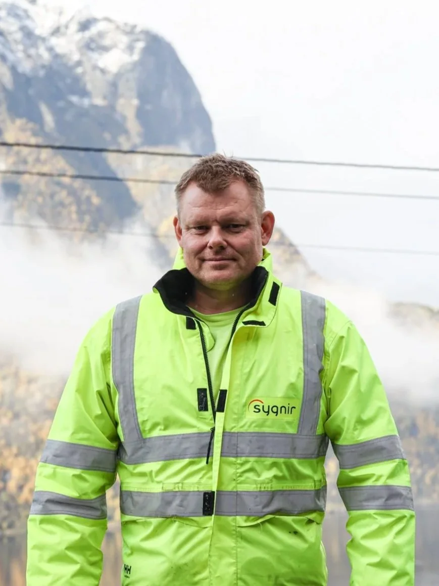 Kai André Onstad er ein av fleire stolte og dyktige montørar frå Aurlandsbasen til Sygnir. Ved sidan av å drifta Noregs brattaste nett har Sygnir mykje arbeid med å klargjera nettet for ei framtid i det grøne skiftet. Foto: Sognekraft.